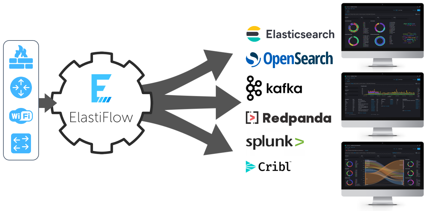 ElastiFlow's network observability solutions, simplify the collection of network traffic flows and telemetry. Our collectors are easily integrated with your chosen data platform to provide unparalleled visibility and insights. The provided dashboards and analytics allow you to understand your network for many use-cases, including: