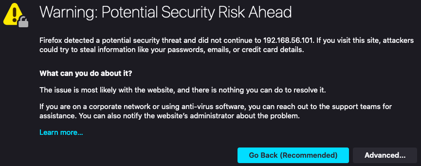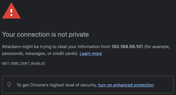 You should now be able to access Kibana at https://IP_OF_KIBANA_HOST:5601. Since this HTTPS connection is using a self-signed certificate, you may see an error similar to the following.