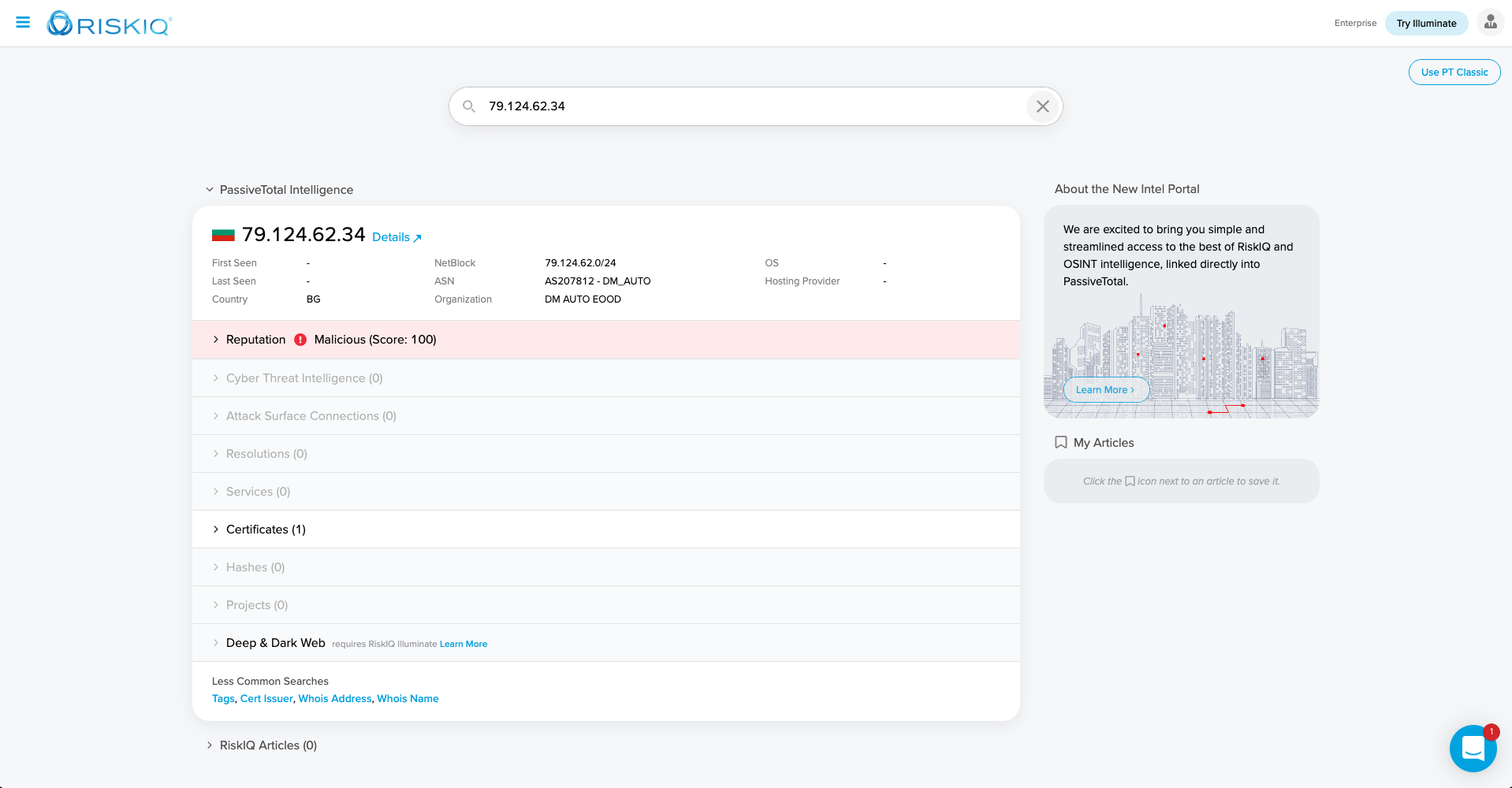 To use RiskIQ enrichment features it is necessary to register for a RiskIQ PassiveTotal account, as well as enable both the RiskIQ output and enrichment options. For a complete description of all RiskIQ configuration options, please refer to the Configuration Reference.