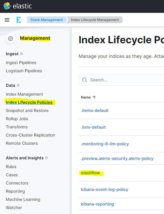The default Index Lifecycle Management (ILM) lifecycle is elastiflow. If this lifecycle doesn't exist, a basic lifecycle will be added, removing data after seven days. This lifecycle can be edited later via Kibana or the Elasticsearch ILM API.