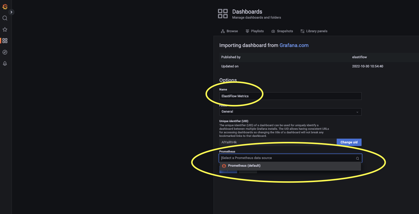 2. Accept the default or give the dashboard a name and place it in the folder you'd like it to reside in. After this point to the Prometheus Datasource you previously connected above click "Import" and you are done.